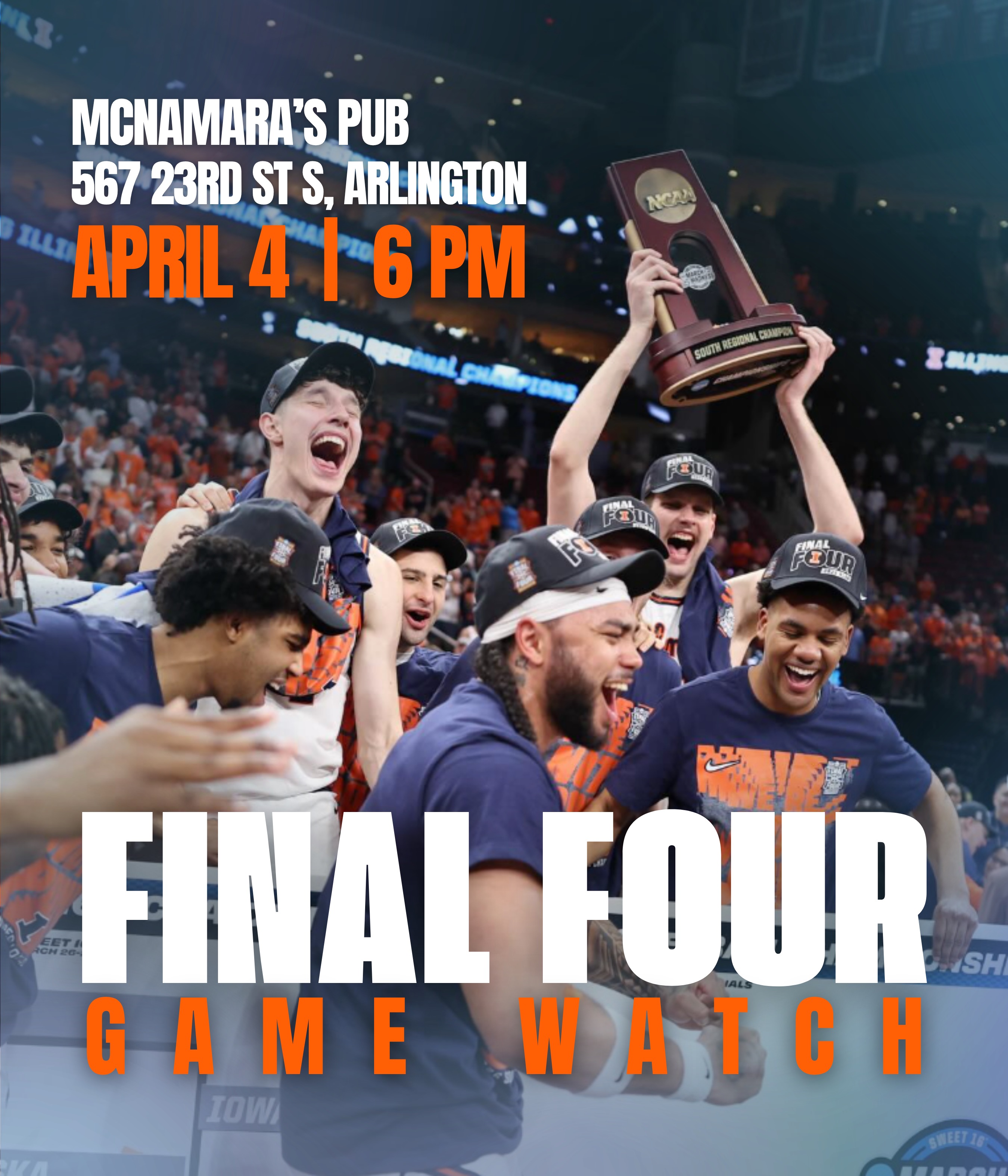 6:00PM - 8:30PM Sat 4 Apr 2026 Eastern timezoneJoin us this SATURDAY to watch your FIGHTING ILLINI in their first FINAL FOUR in 21 YEARS!! We're back at McNamara's in Crystal City. -